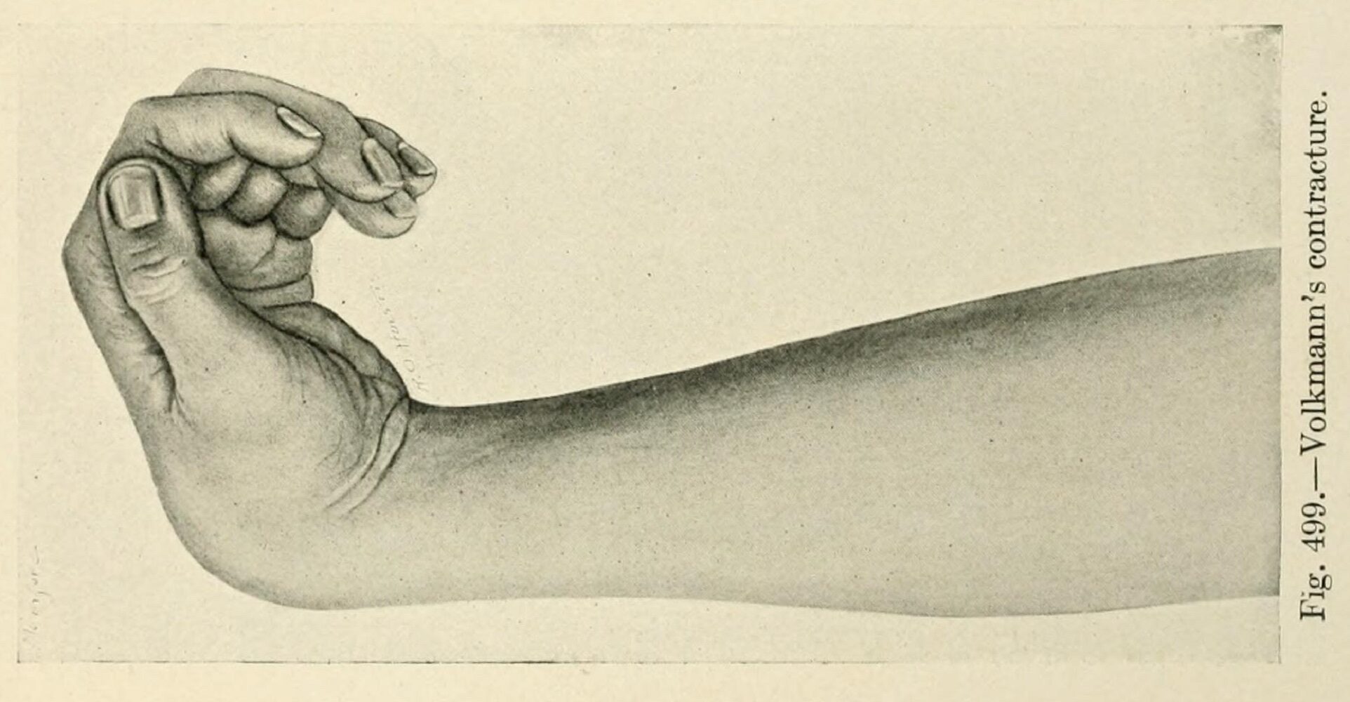 Contracture of forearm muscles, often caused by injury, leads to a permanent shortening, resulting in a clawlike deformity of the hand, fingers, and wrist. This condition is more prevalent in children. Most common aetiology is ischaemia due to supra condylar fracture of humerus causing compartment syndrome which compresses brachial artery. (Read more about this topic here
