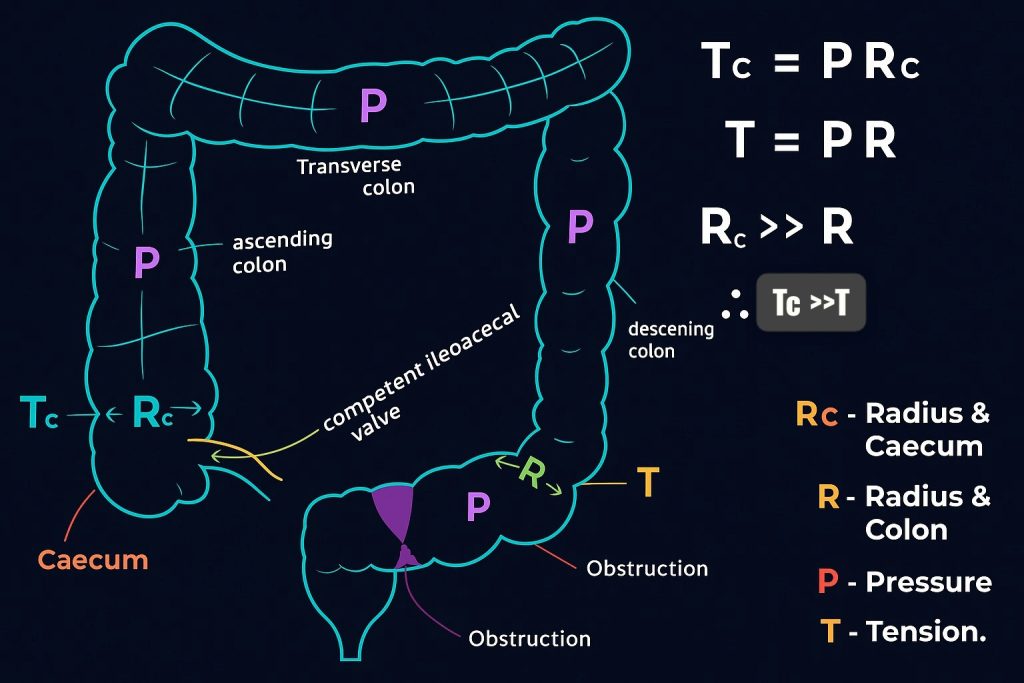 This can be explained using the physics concept Laplace’s Law, which states that the tension (T) in the wall of a hollow organ (like the caecum) is directly proportional to the pressure(P) inside and the radius(R)  of the organ.